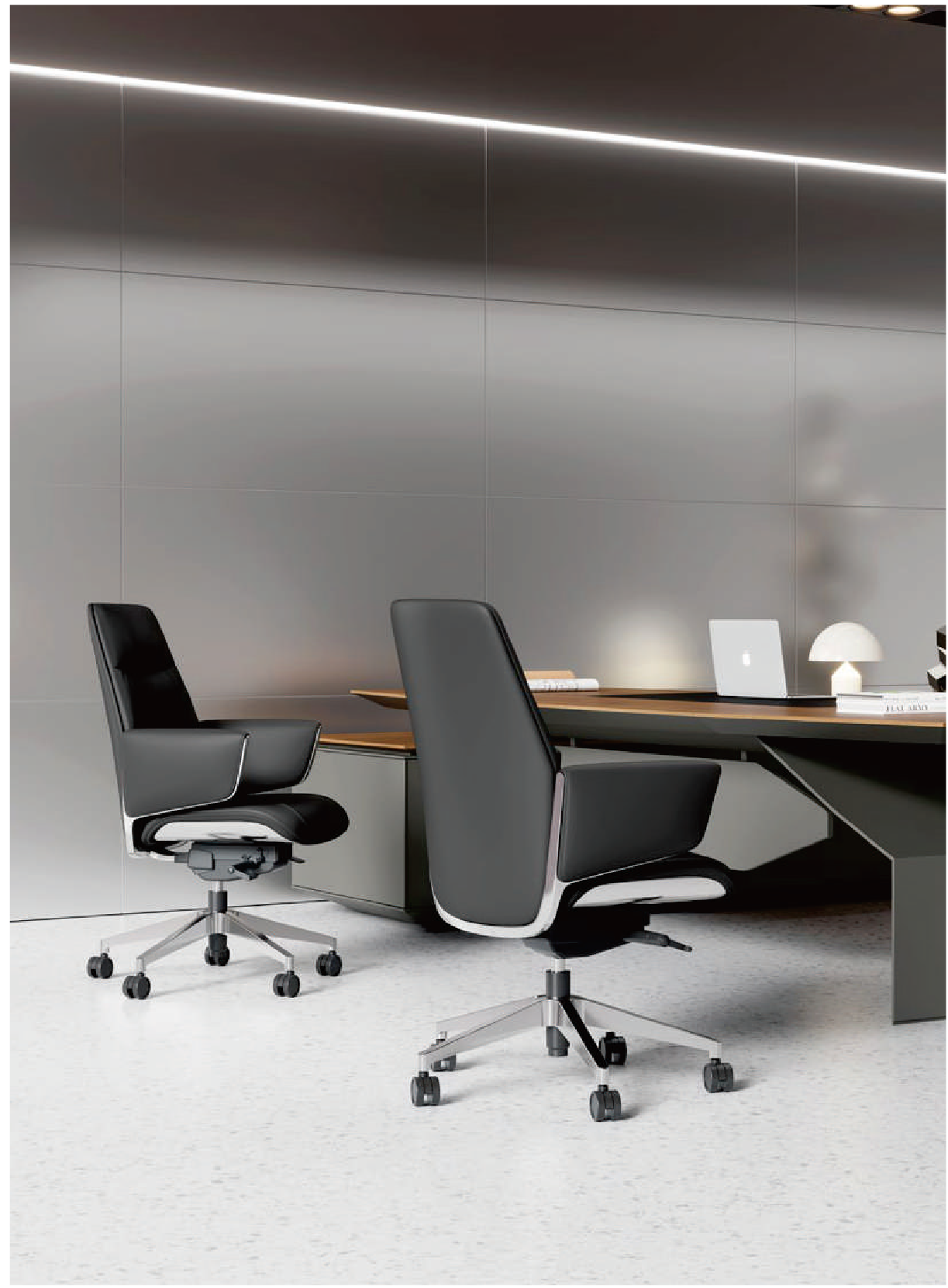 The Élan Noir was conceived for the discerning decision-maker — where heritage design meets future-forward performance. Drawing influence from French postmodernism and executive precision, the chair balances sculptural lines with soft ergonomics, evoking both permanence and elegance. Its floating backrest and whisper-quiet glide speak to presence without force — a chair for those who lead with assured restraint.