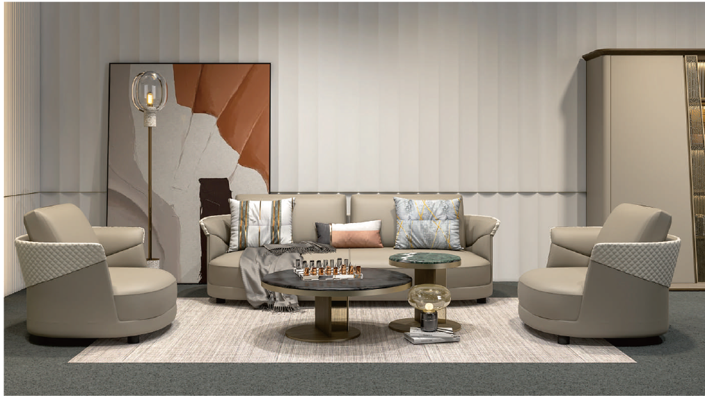 The Pavane suite offers a cocooning experience layered with tonal elegance and plush contours. Neutral leather upholstery blends seamlessly with quilted fabric detailing, creating contrast and texture without visual clutter. Every element—from the curved arms to the low-slung base—has been considered for comfort and timeless design, making this an effortless anchor for refined lounge settings